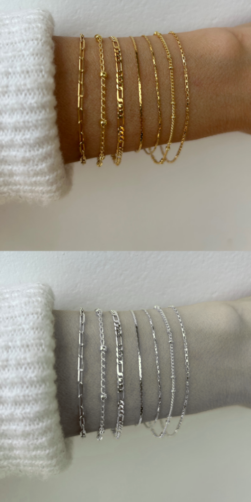 Des bracelets fins, en or ou en argent, qui habillent le poignet d’un éclat discret et d’une élégance naturelle.